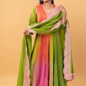 This exquisite ensemble includes a Gaji Silk palazzo and a silk tissue ombre shaded embroidered dupatta (3 pieces). This attire offers a luxurious and elegant look suitable for any occasion.